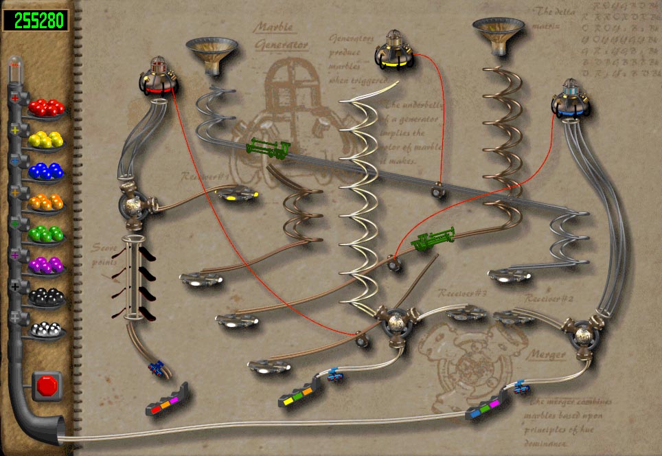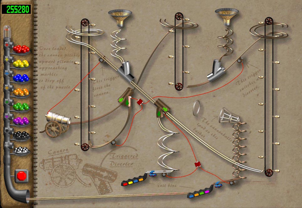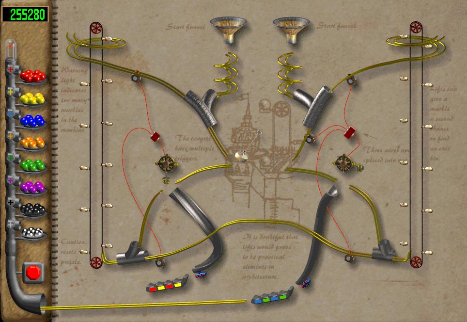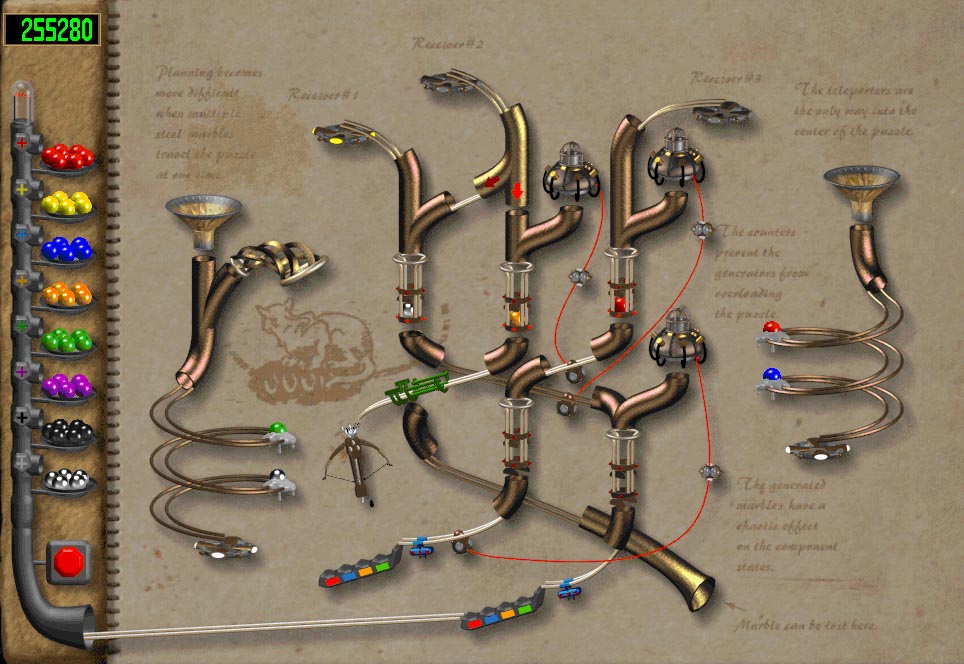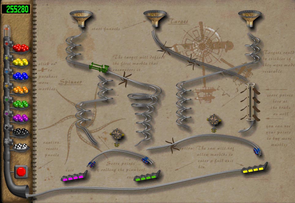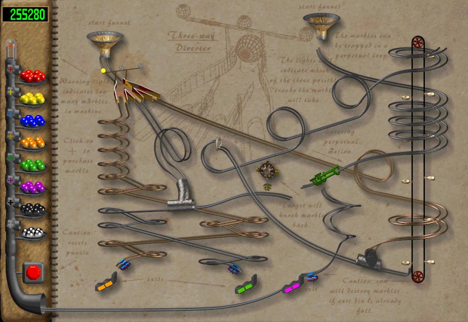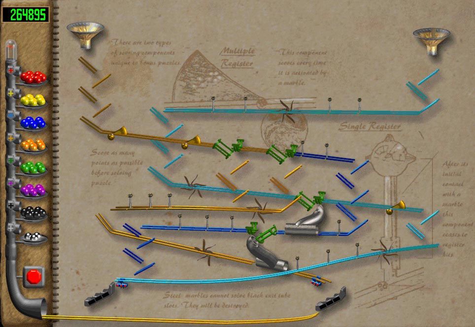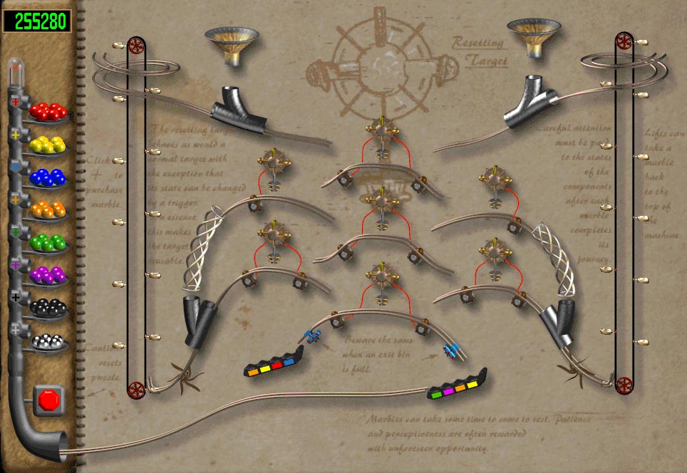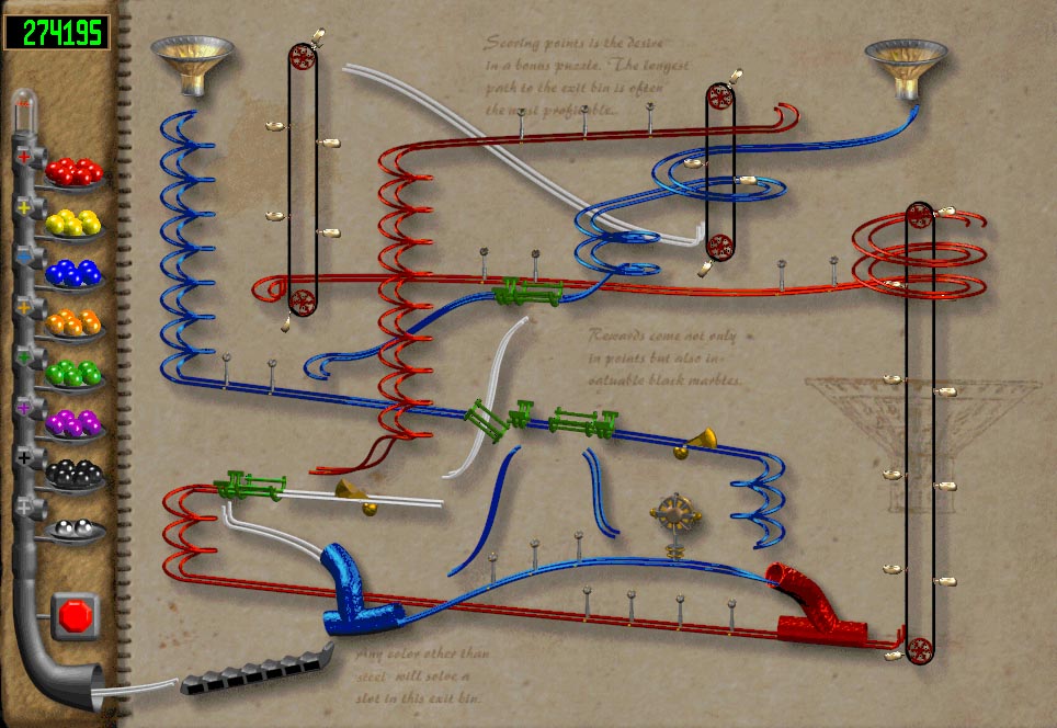 In many of the puzzles, the player needs to waste one or more marbles to solve the puzzle. These “wasted” marbles go down the “wrong” paths and are destroyed by the puzzle, but in doing so they flip diverters and trigger state changes in other components, which pave the way for subsequent marbles that can solve the puzzle. The beauty of this game (and what makes it addictive) is that there are many ways to solve each of the puzzles, but often only a small handful of optimal strategies (that waste the least amount of marbles).