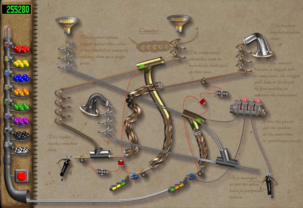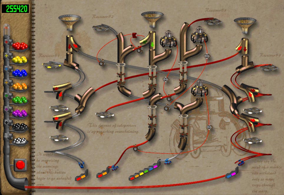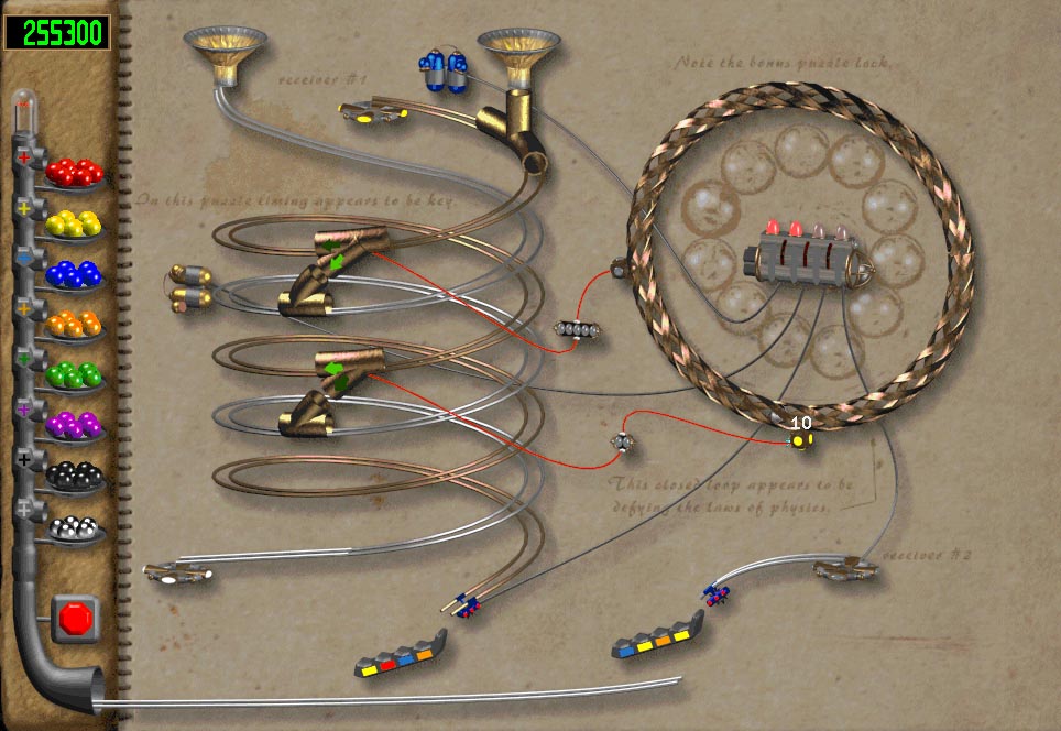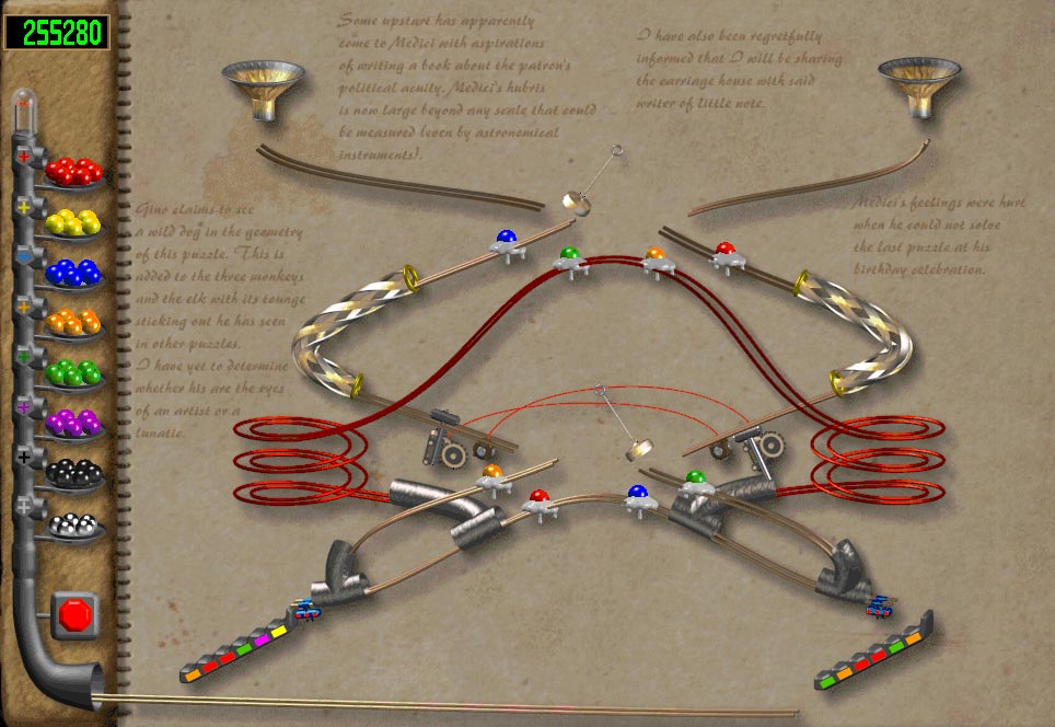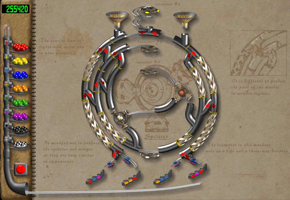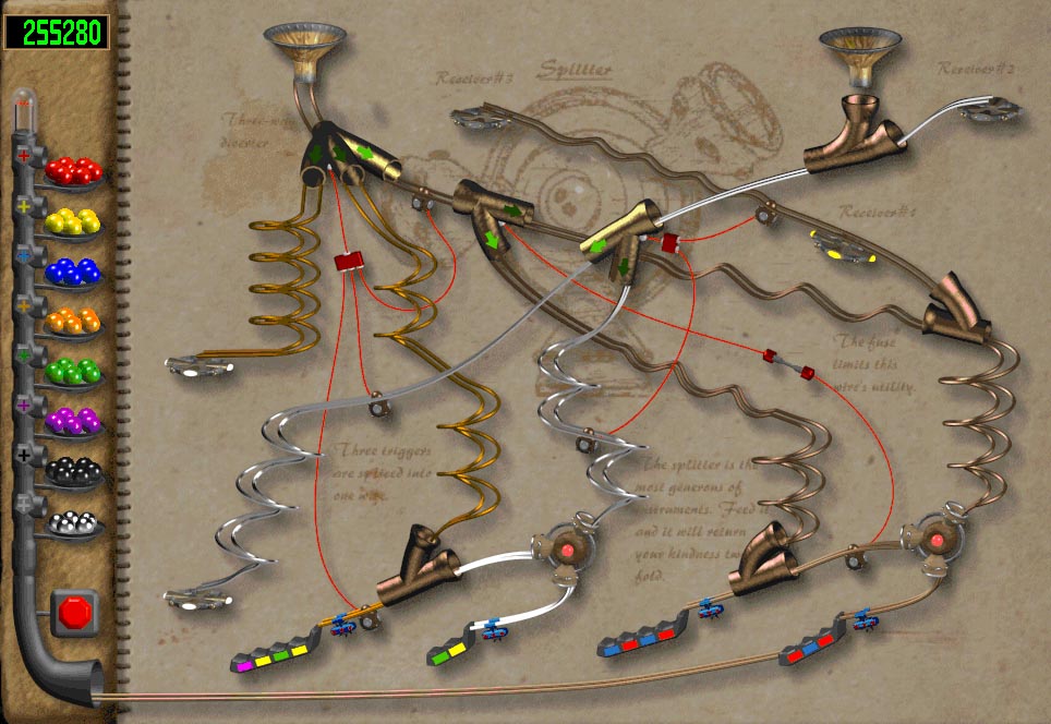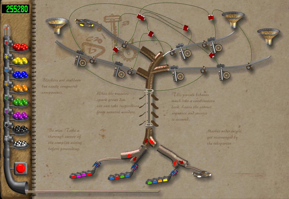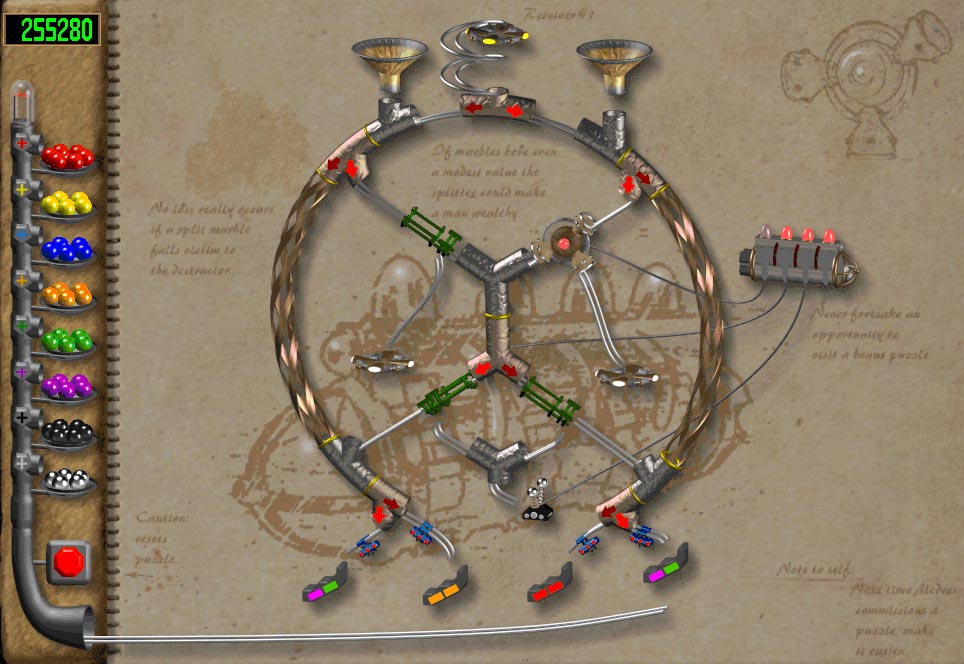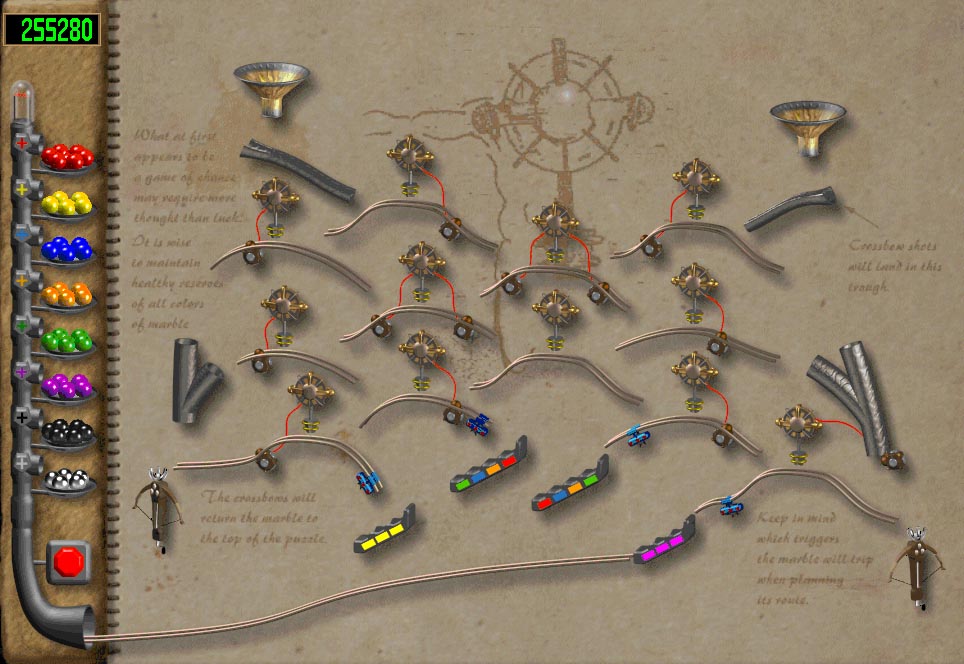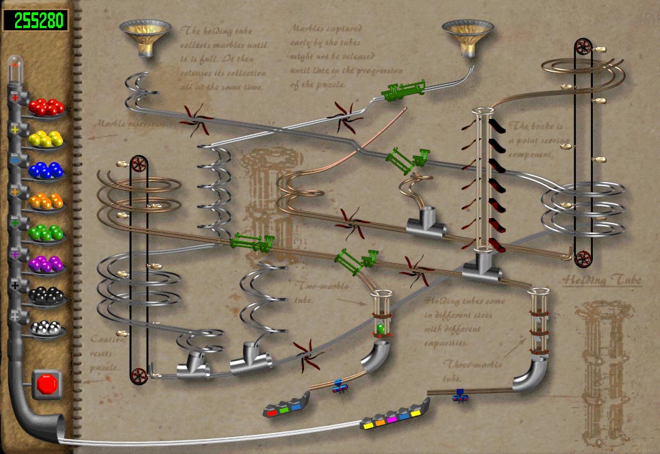 In many of the puzzles, the player needs to waste one or more marbles to solve the puzzle. These “wasted” marbles go down the “wrong” paths and are destroyed by the puzzle, but in doing so they flip diverters and trigger state changes in other components, which pave the way for subsequent marbles that can solve the puzzle. The beauty of this game (and what makes it addictive) is that there are many ways to solve each of the puzzles, but often only a small handful of optimal strategies (that waste the least amount of marbles).