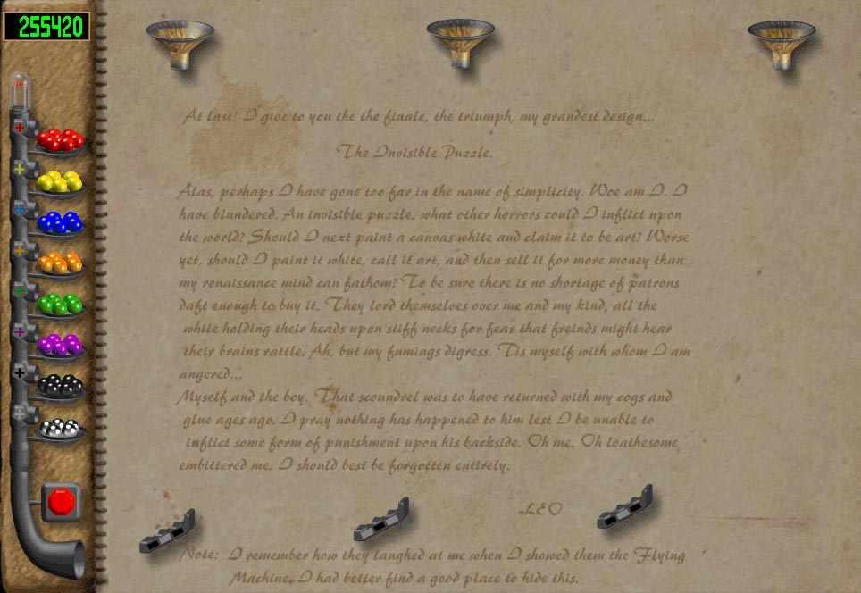 - At last! I give to you the finale, the triumph, my grandest design... The Invisible Puzzle. Alas, perhaps I have gone too far in the name of simplicity. Woe am I. I have blundered. An invisible puzzle, what other horrors could I inflict upon the world: Should I next paint a canvas white and claim it to be art? Worse yet, should I paint it white, call it art, and then sell it for more money than my renaissance mind can fathom? To be sure there is no shortage of patrons daft enough to buy it. They lord themselves over me and my kind, all the while holding their heads upon stiff necks for fear that freinds might hear their brains rattle. Ah, but my fumings digress. Tis myself with whom I am angered... Myself and the boy. That scoundrel was to have returned with my cogs and glue ages ago. I pray nothing has happened to him lest I be unable to influct some form of punishment upon his backside. Oh me. Oh loathesome, embittered me. I should best be forgotten entirely. -LEO