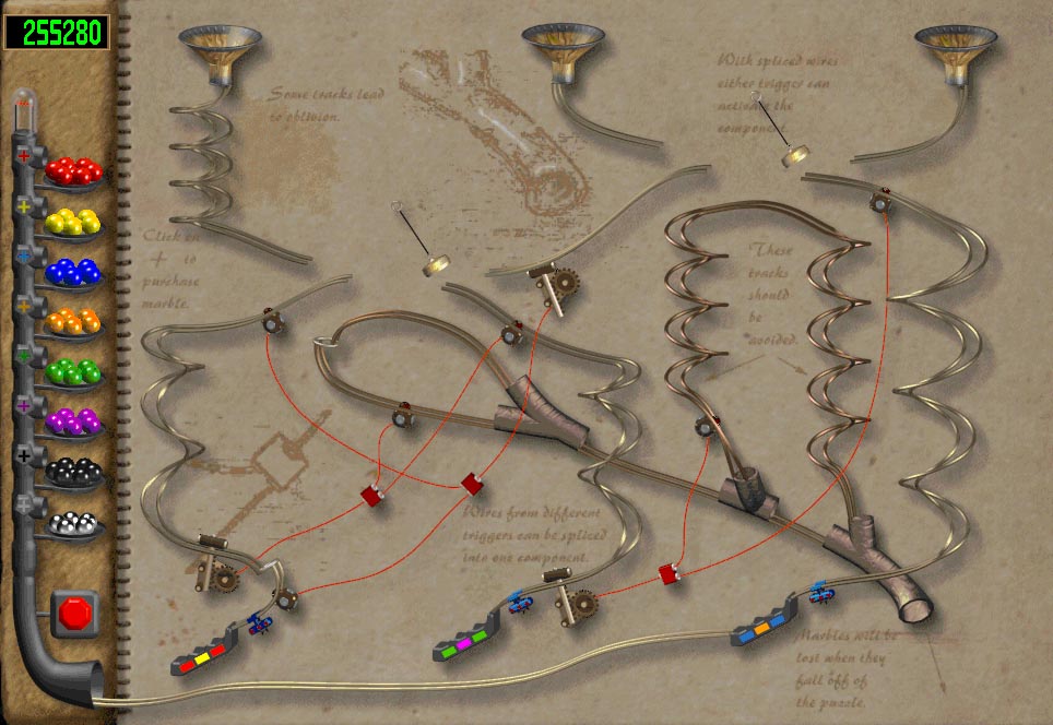 Players are given an initial set of marbles […] These marbles are picked up and dropped by the players into funnels leading to a series of rails, switches, traps and other devices which grow more complex as the game progresses. The aim is to ensure that each marble arrives in the bin of the same color as the marble. Players must determine how the marble will travel through the puzzle, and how its journey will change the puzzle for the next marble. When a marble runs over certain sections of the puzzle, the paths may be rerouted or cut off, either temporarily or permanently. For example, if the marble runs over a button, it might hop, skip and jump a diversion that sends the next marble down a different road.
