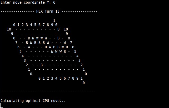 Hex109 is a command line C++ implementation of the Game of Hex board game, with a text interface and a Monte Carlo AI. I created it as a requirement of the CMPS 109: Advanced Programming course at University of California, Santa Cruz.